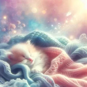«A fluffy kitten curled up on a bed of pastel-colored blankets, s...»