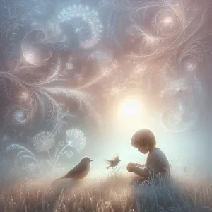 «A child playing with a small bird on a peaceful, foggy morning....»