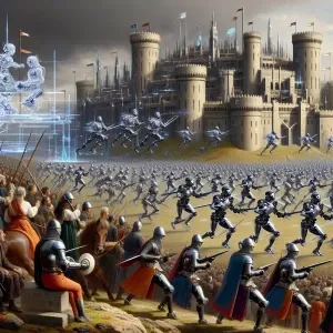 «A chaotic battlefield with knights in traditional plate armor fi...»