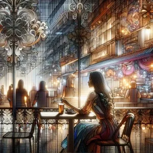 «A young woman sitting at a cafe table on a bustling street, her...»