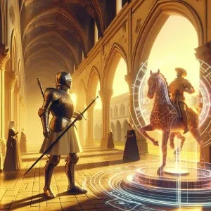 «A medieval knight standing in a golden-lit courtyard, holding a...»