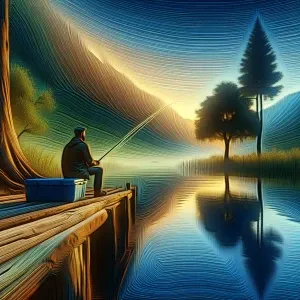 «A lone fisherman sitting by a calm pond, with ripples on the wat...»