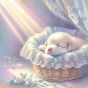 «A sleeping puppy nestled in a basket under a soft, pale sunbeam...»