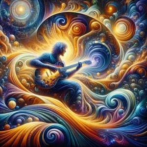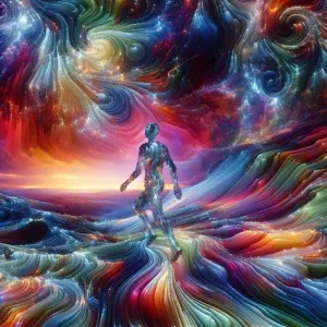 «A cosmic traveler walking along an alien terrain under a vibrant...»