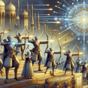 «A small group of archers in ornate Renaissance armor shooting gl...»