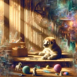«A puppy resting on a wooden porch, with a few toys scattered aro...»