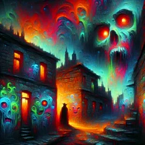 «Twisted, nightmarish graffiti covering a decaying urban alleyway...»
