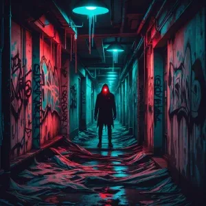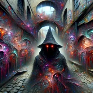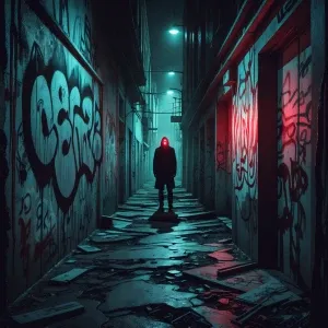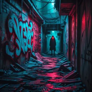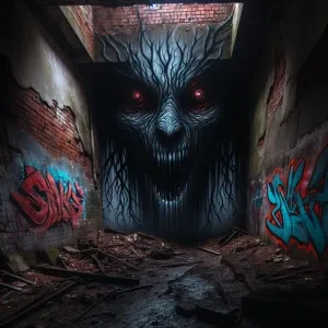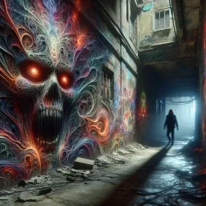 «Twisted, nightmarish graffiti covering a decaying urban alleyway...»