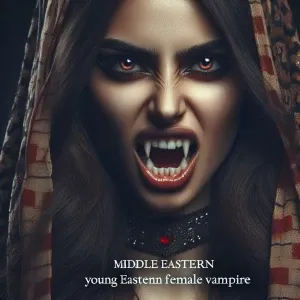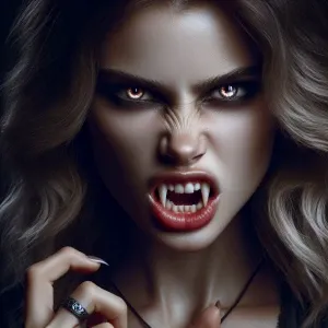 «Generate hyper-realistic image of a young, fierce female vampire...»