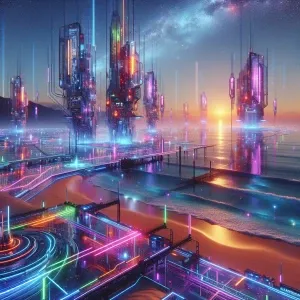 «Create an image depicting a vibrant and colorful futuristic beac...»