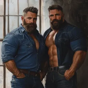 «bodybuilder men stand side by side. Both have thick, full beards...»