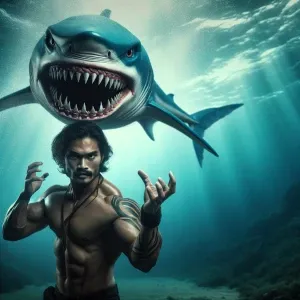 «Full-body photograph of a muscular, shark-like woman, with an op...»