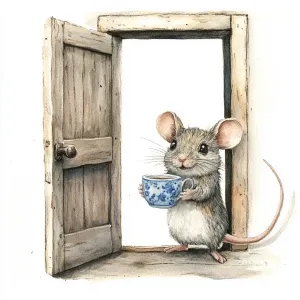 «Mouse in open door, watercolor, holding a tiny blue delft cup of...»