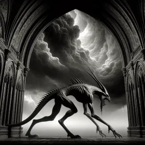 «Create an image of an acephalous mythical creature in a dramatic...»