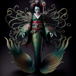 «Create a piece of art featuring a geisha mermaid action figure....»