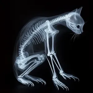 «Generate a hyperrealistic image of an ethereal cat skeleton that...»