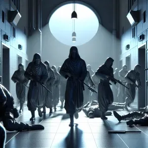 «In the dead of night, a shadowy group of ninjas silently infiltr...»
