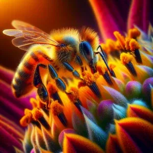 «A detailed shot of a honeybee gathering pollen from a brightly c...»
