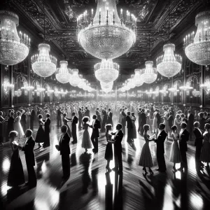 «An elegant ballroom filled with chandeliers, polished floors, an...»