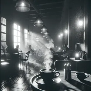 «A cozy café on a rainy evening, with steam rising from coffee cu...»