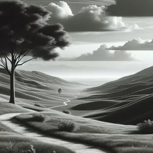 «A tranquil landscape of rolling hills, a lone tree standing agai...»