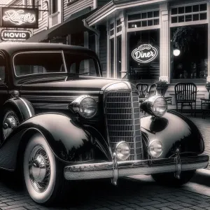 «A classic car parked in front of a vintage diner, with its chrom...»