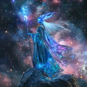 «Create a hyper-realistic image of an alien witch with shimmering...»