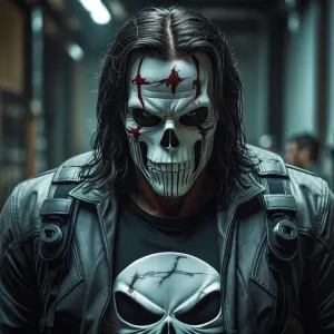 «Depict an intense scene featuring The Punisher, dressed in his i...»