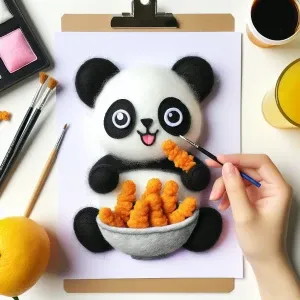 «A cute image of a felt panda eating Chinese food chicken fingers»