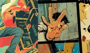 «Collage-style comic: 1) Superhero battling a robot in a splash p...»
