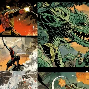 «Collage-style comic: 1) robot ninja battling a lizard monster in...»