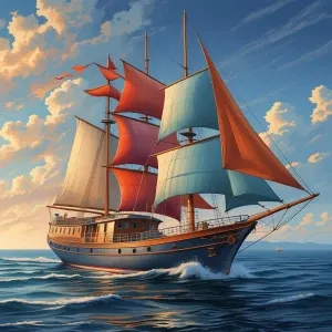 «Barca a vela e casette colorate in lontananza stile fumetto real...»