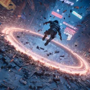 «“A cyberpunk warrior launches from a shattered rooftop, leaving...»