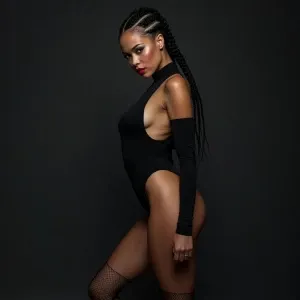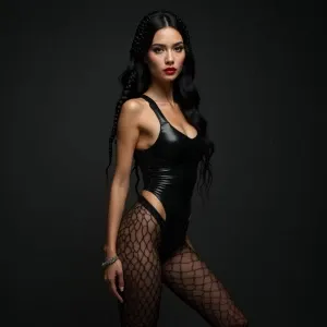 «A powerful studio shot of Dahlia Valentina wearing a sleek, blac...»