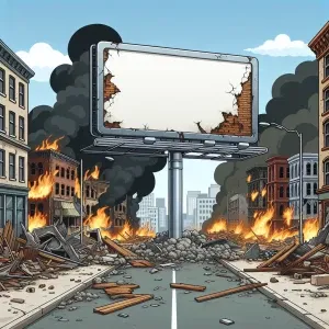«A large empty billboard engulfed in flames, dominating the foreg...»