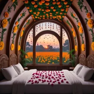«A mysterious chamber with a massive crescent-shaped door framed...»