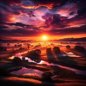 «A sunrise over a serene lake, with the water reflecting the vibr...»