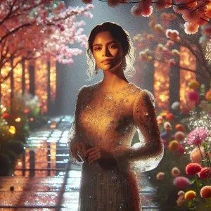 «"A beautiful woman standing in a softly lit garden, her skin glo...»