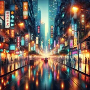 «An urban street scene at twilight, with glowing neon signs, wet...»