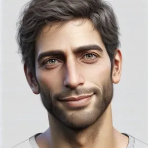 «Create a realistic portrait of a man in his 30s with expressive...»
