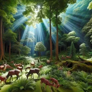 «A family of deer grazing in a dense forest clearing, with sunlig...»
