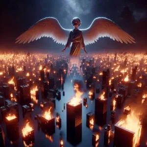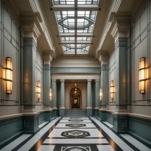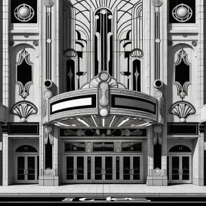 «Create a detailed image of a theater entrance with bold symmetry...»