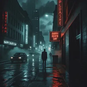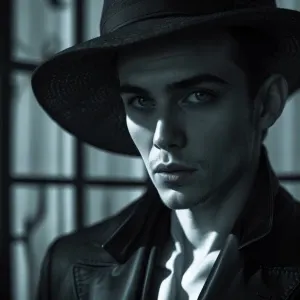 «A detective in a trench coat walking through a foggy, rain-soake...»