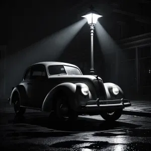 «A vintage car parked under a flickering streetlamp, with long sh...»