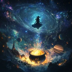 «Create a 2.5D image featuring an alien witch floating above a lu...»