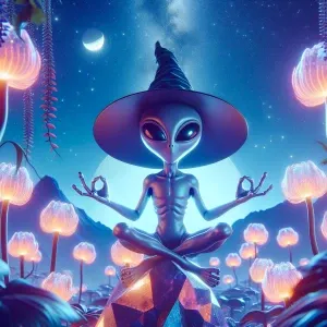 «A stylized 2D illustration of an alien witch meditating on a cry...»