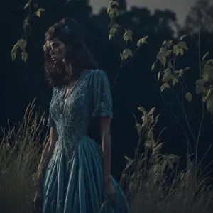 «Create an image of a woman in a long, flowing blue dress with in...»