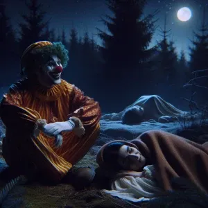 «Generate an image of two clowns laughing at the lifeless body of...»