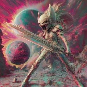 «Create a 3D stereograph image of an alien girl with a ferocious...»