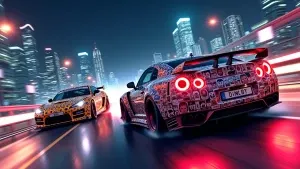 «high-speed race between sports cars covered with meme stickers,...»